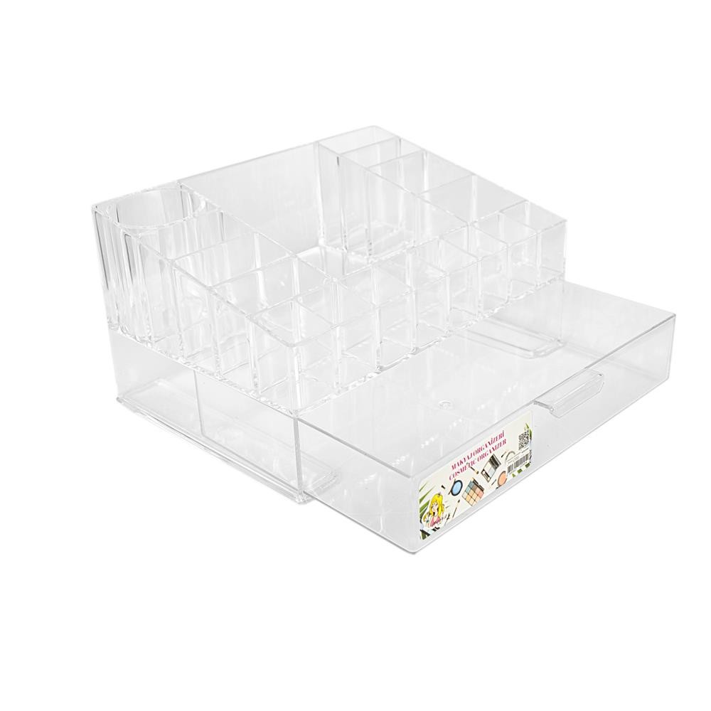 Οργανώστε εύκολα κραγιόν, μάσκαρα, πινέλα και μικρά αξεσουάρ σε μια κομψή, διάφανη βάση με 18 πρακτικές θήκες. Ιδανική για χρήση στο μπάνιο, το γραφείο ή το μπουντουάρ, αλλά και για επαγγελματική χρήση σε studio ή χώρους ομορφιάς.