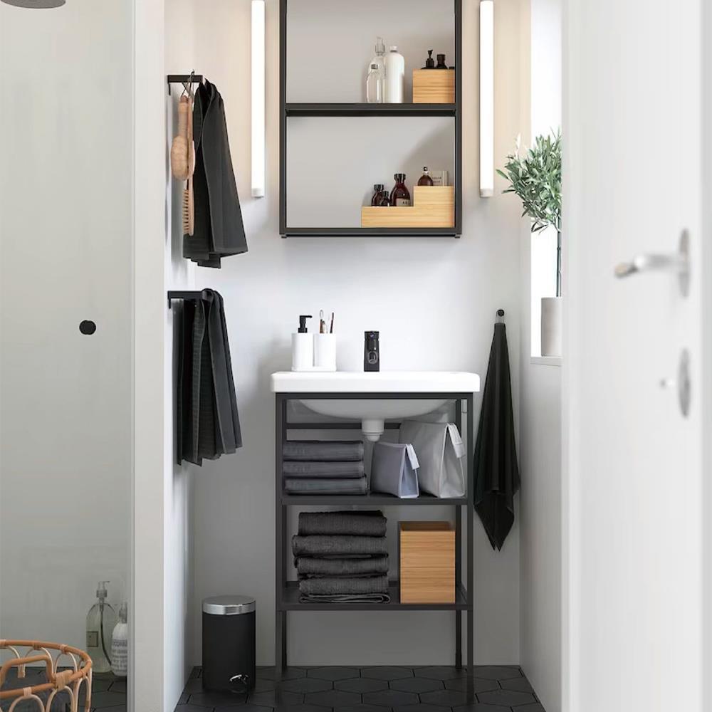 Αυτό το σετ επίπλων μπάνιου, περιλαμβάνει μονό νιπτήρα με ανοιχτά ράφια – μοντέρνα ραφιέρα μπάνιου που τοποθετείται στον τοίχο. Μεταλλικός σκελετός και εύκολη συναρμολόγηση. Χρώμα: Μαύρο Υλικό νιπτήρα: κεραμικός, Μέγιστο βάρος αντοχής ανά ράφι, Διαστάσεις βάσης νιπτήρα Y80x50.5×39.5εκ Διαστάσεις ραφιού : Y70x50.5×15εκ.