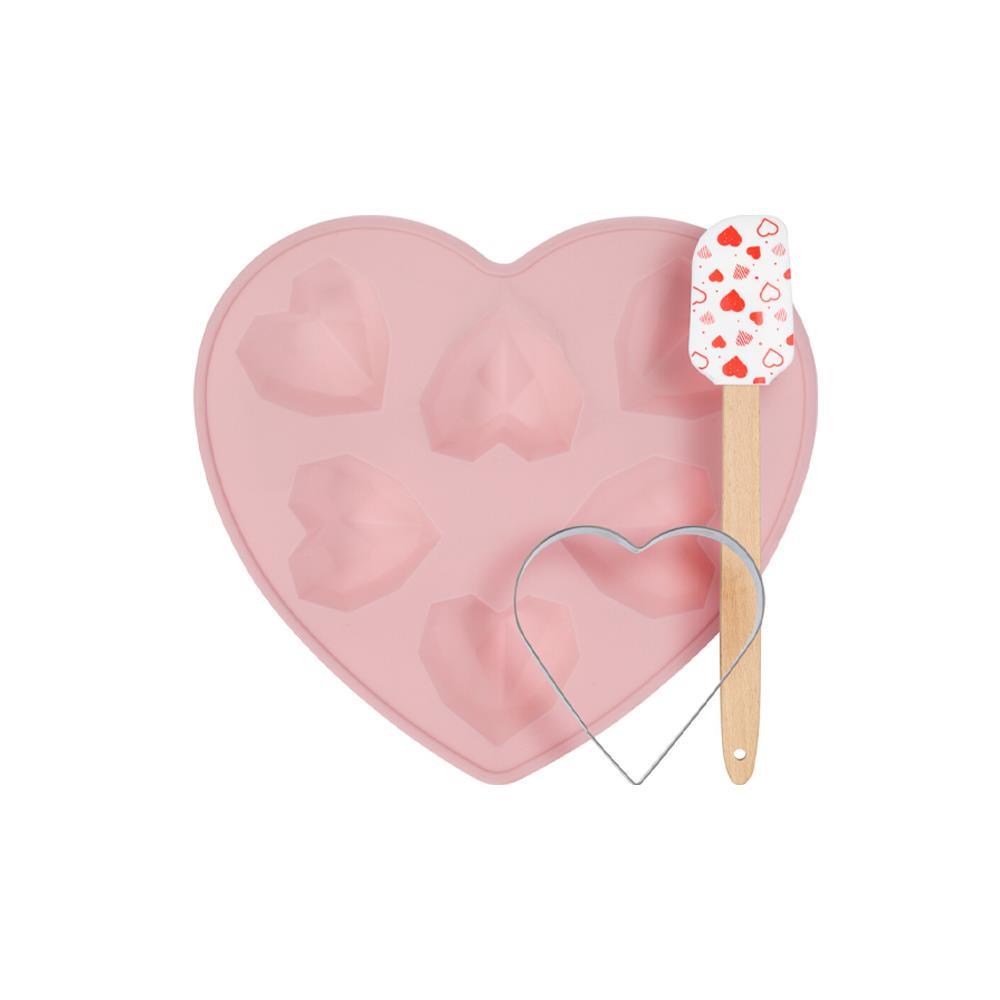 Σετ ψησίματος καρδιά 3 τεμαχίων (φόρμα από σιλικόνη, σπάτουλα και 1 κουπ πατ για μπισκότα).