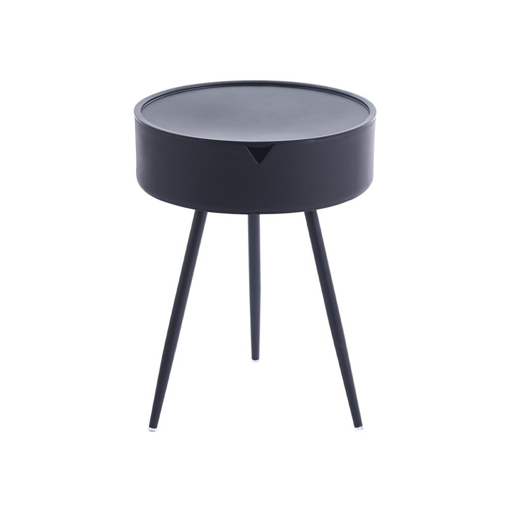 Τραπεζάκι σαλονιού με πλαστική επιφάνεια και μεταλλικά πόδια με επίστρωση πούδρας. Διαθέτει αποθηκευτικό χώρο κάτω από το καπάκι, ιδανικό για μικροαντικείμενα ή περιοδικά. Συνδυάζει λειτουργικότητα και μοντέρνα αισθητική, κατάλληλο για σαλόνι, υπνοδωμάτιο ή επαγγελματικούς χώρους. Μπορεί να χρησιμοποηθεί ως κομοδίνο δίπλα στο κρεβάτι. Διαστάσεις προϊόντος: Ø40,5×Υ54 εκ., συσκευασίας: 41,5×41,5×16 εκ. Βάρος: 2,65 κιλά.